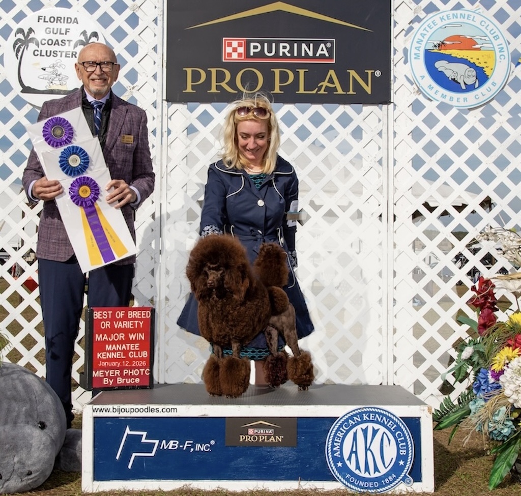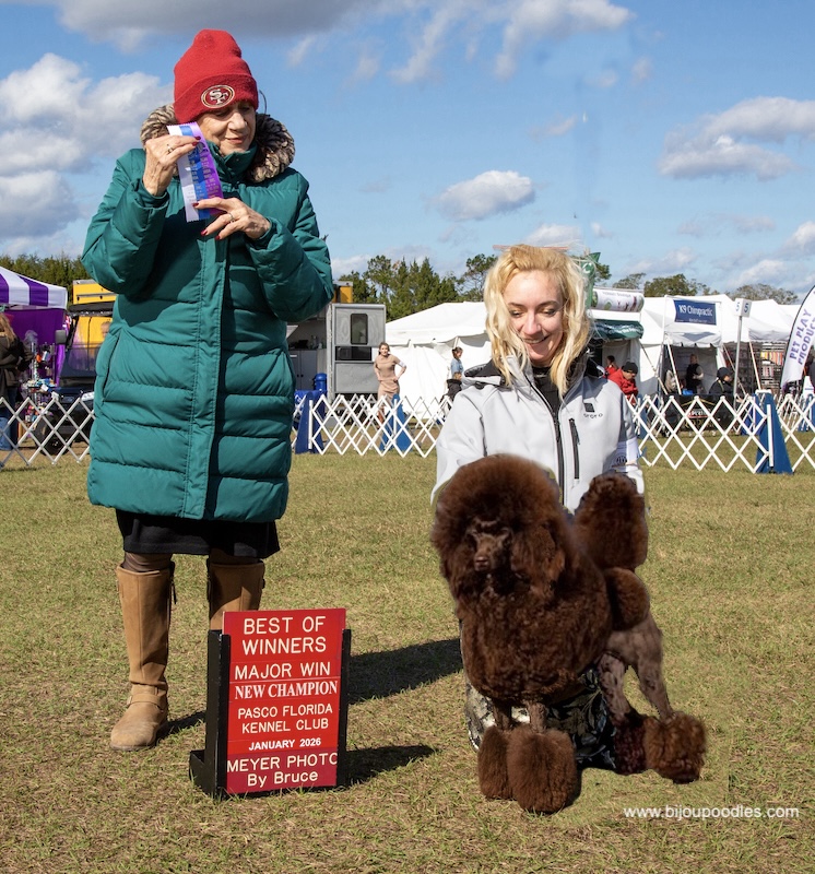 Nunya is currently showing in AKC and won Best of Opposite at a Poodle Specialty and got